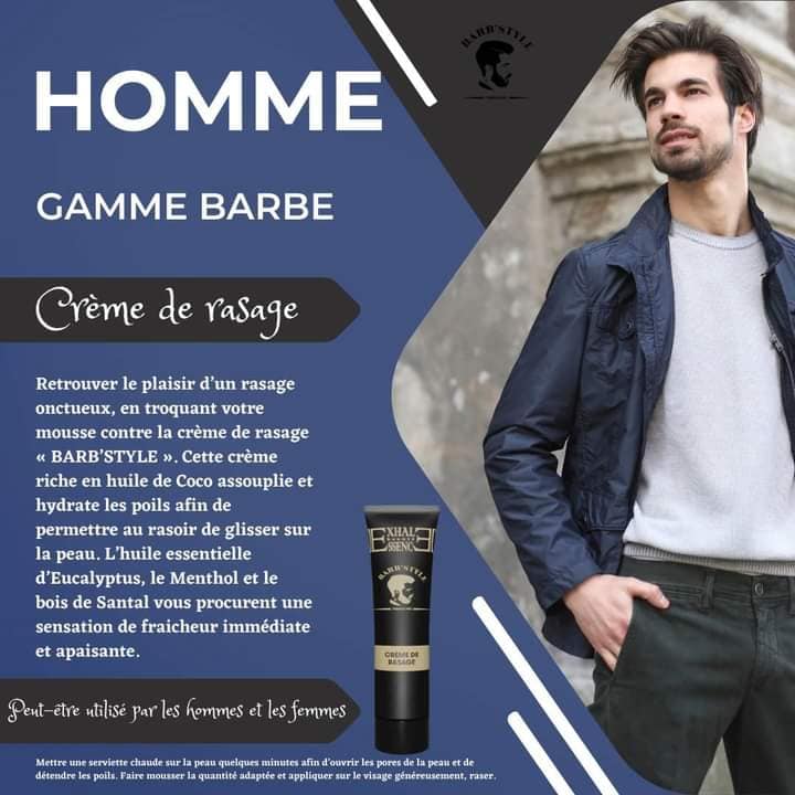 BARB’STYLE : Notre Crème de Rasage onctueuse pour un rasage traditionnel parfait. Fabriquée en France, elle est riche en Huile de Coco pour assouplir le poil et garantir une glisse exceptionnelle du rasoir. Finis les irritations ! Enrichie en Eucalyptus, Menthol et Bois de Santal, elle procure une sensation de fraîcheur apaisante immédiate.